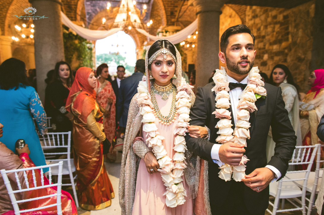 Bride and groom walk away as husband and wife in their traditional floral garlands, created by Raining Roses.